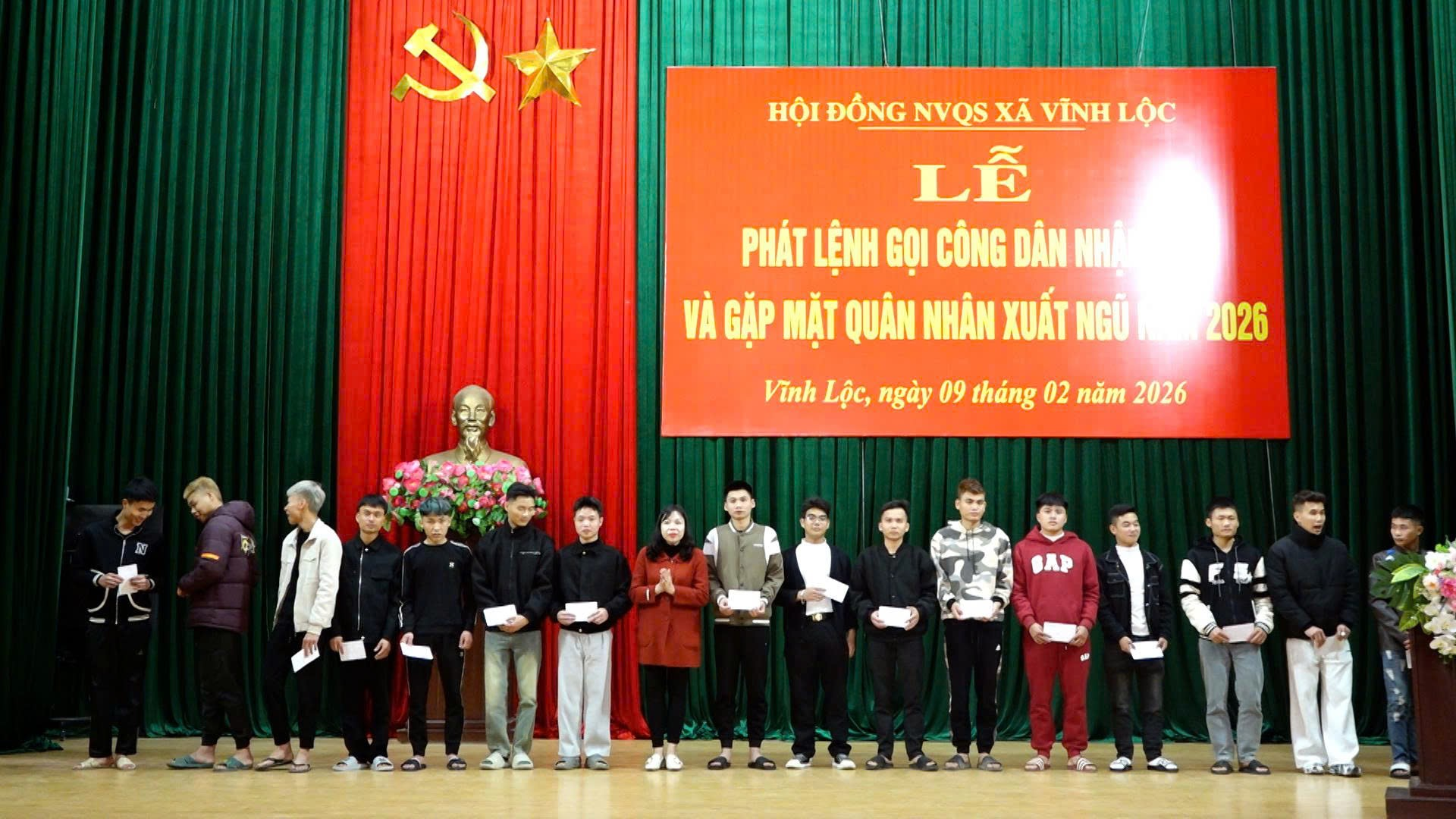 Chiều ngày 9/2, xã Vĩnh Lộc tổ chức hội nghị phát lệnh gọi nhập ngũ năm 2026 và gặp mặt quân nhân hoàn thành nghĩa vụ quân sự trở về địa phương.