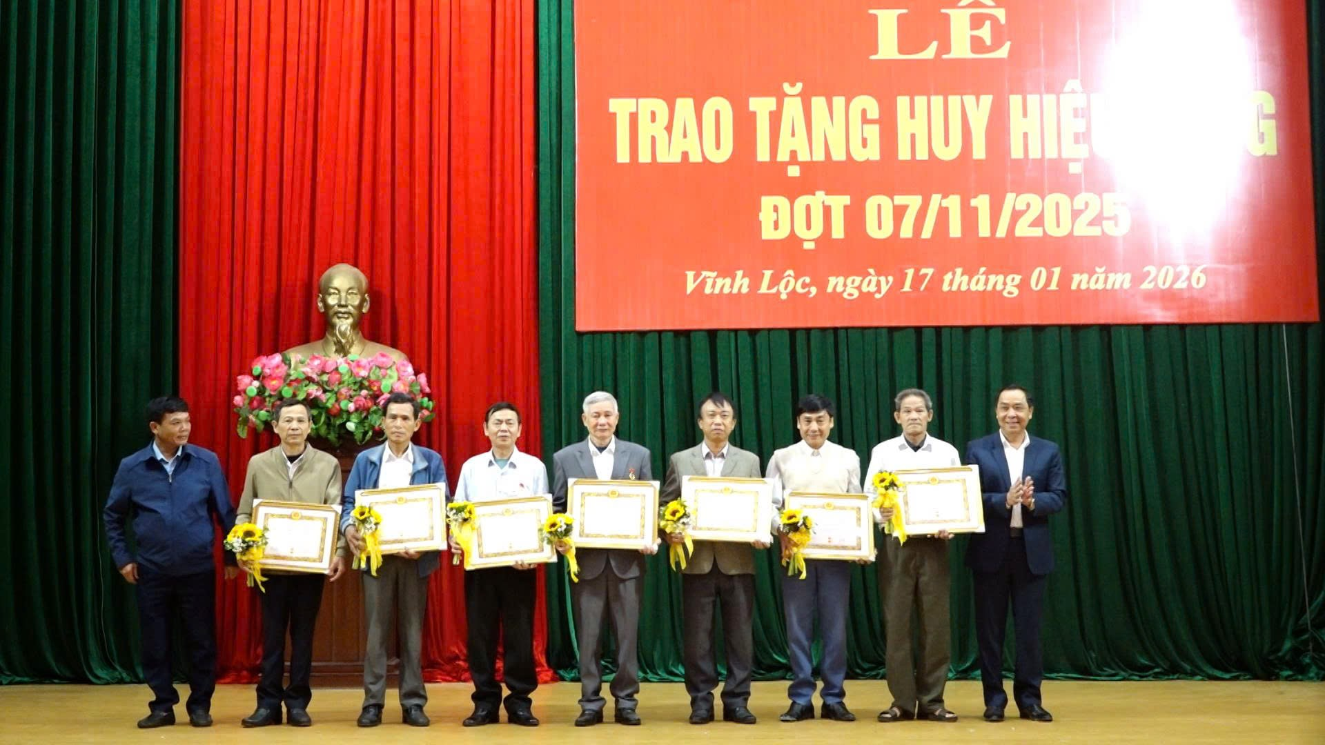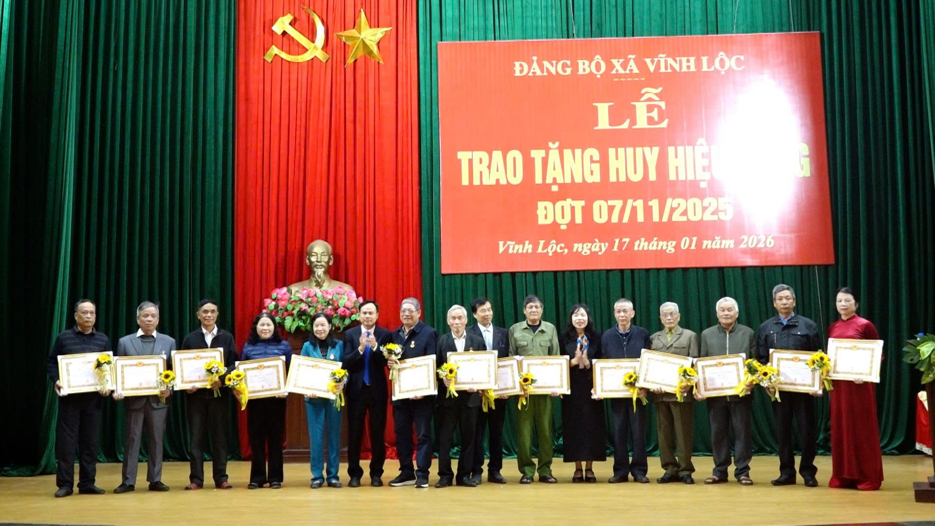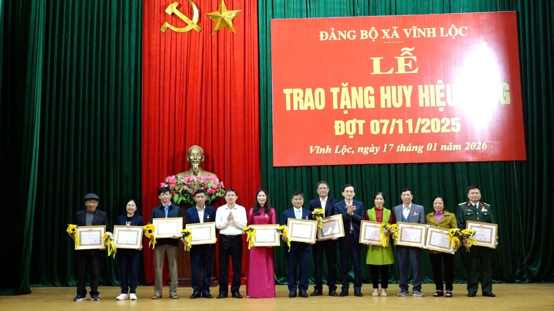 Tại buổi lễ, đồng chí Lưu Thị Thương, Ủy viên Ban Thường vụ Đảng ủy, Trưởng Ban Xây dựng Đảng xã đã công bố Quyết định trao tặng Huy hiệu Đảng. Theo đó, trong đợt 07/11/2025, xã Vĩnh Lộc có 54 đảng viên vinh dự được trao tặng Huy hiệu Đảng từ 30 năm đến 70 năm tuổi Đảng. Trong đó có 1 đồng chí nhận Huy hiệu 70 năm tuổi Đảng; 1 đồng chí nhận Huy hiệu 65 năm; 3 đồng chí nhận Huy hiệu 60 năm; 3 đồng chí nhận Huy hiệu 55 năm; 6 đồng chí nhận Huy hiệu 50 năm; 15 đồng chí nhận Huy hiệu 45 năm; 10 đồng chí nhận Huy hiệu 40 năm và 15 đồng chí nhận Huy hiệu 30 năm tuổi Đảng và 1 đồng chí được Truy tặng Huy hiệu 50 năm tuổi đảng.