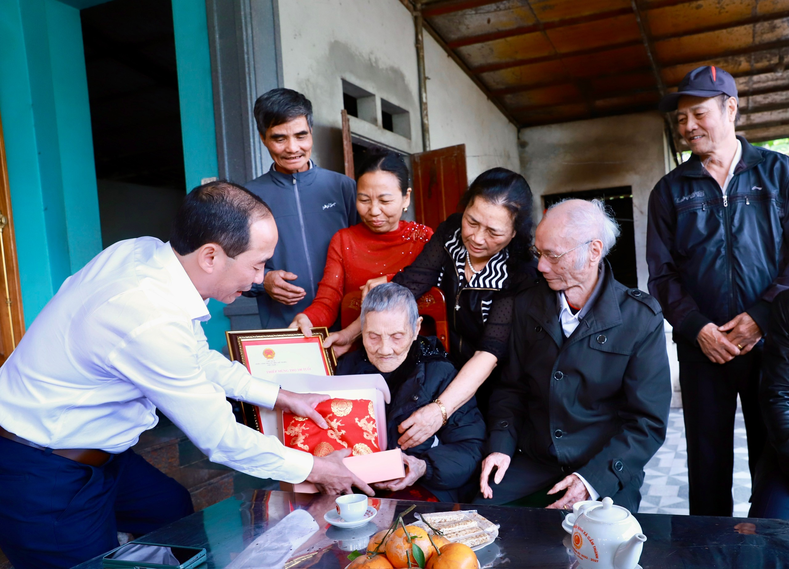 Đồng chí Lê Tiến Lam và các đồng chí lãnh đạo xã thăm, chúc thọ và trao quà cho cụ Nguyễn Thị Sáu (100 tuổi), trú tại khu phố Hà Lương, xã Vĩnh Lộc.
