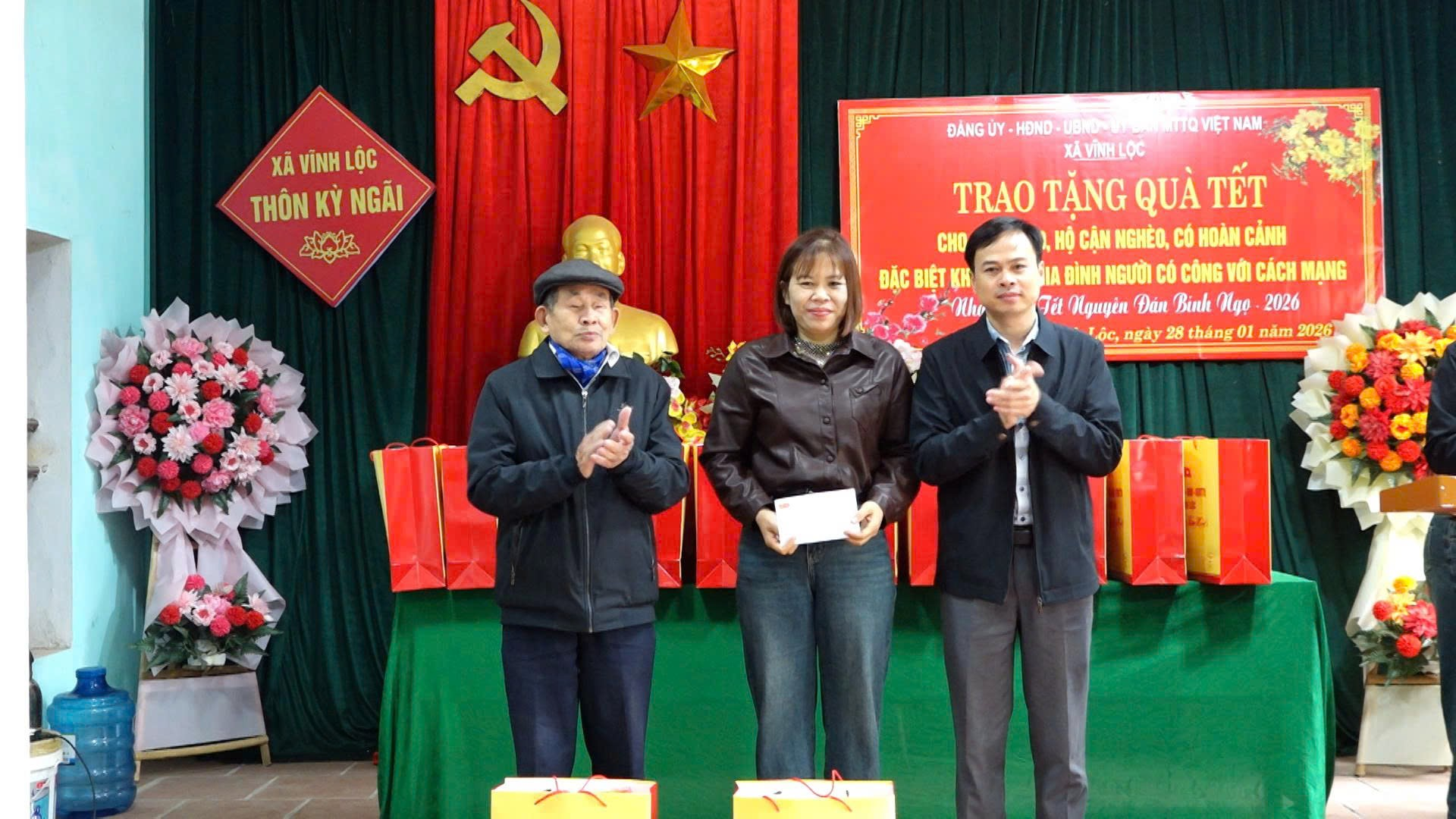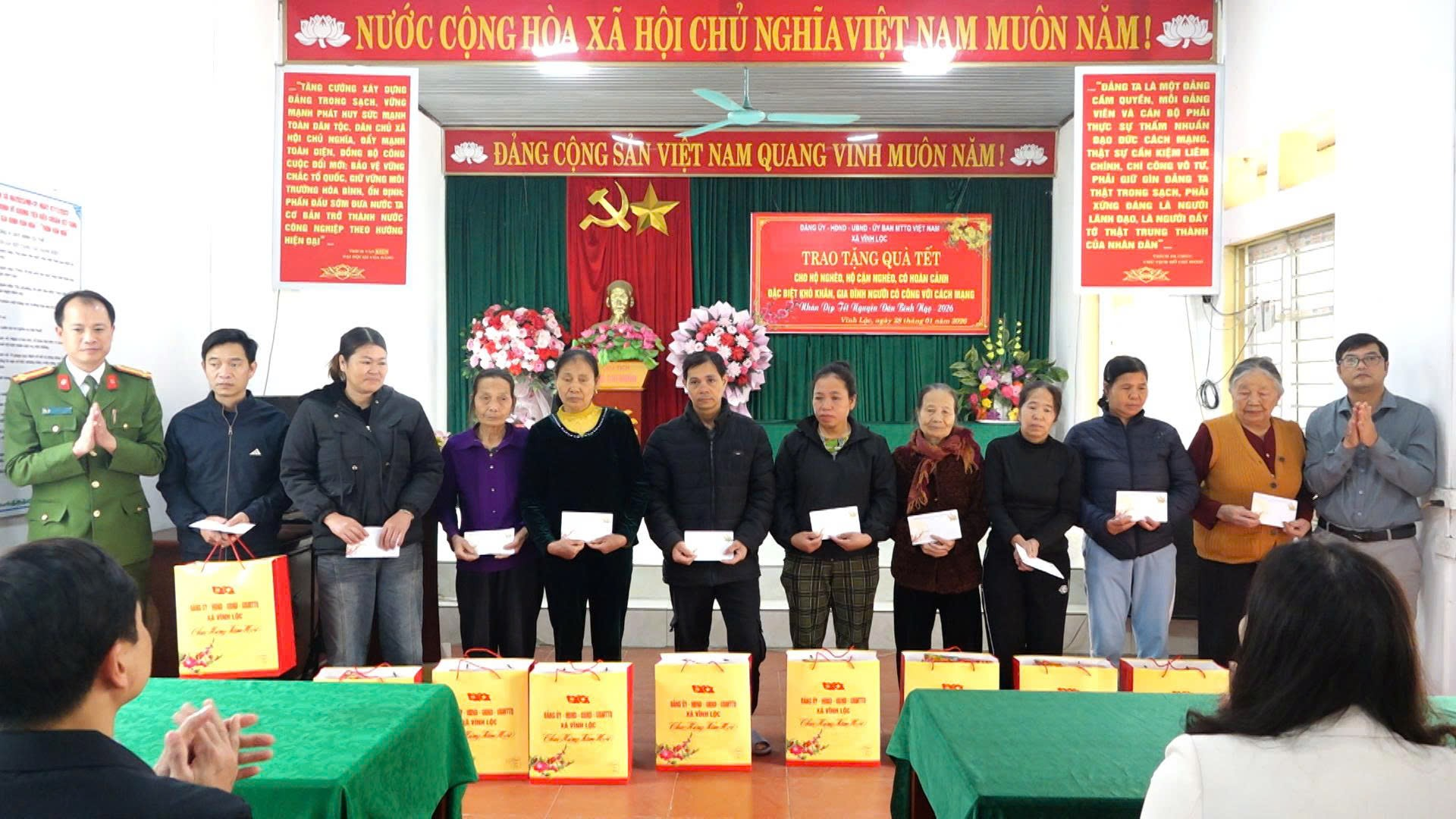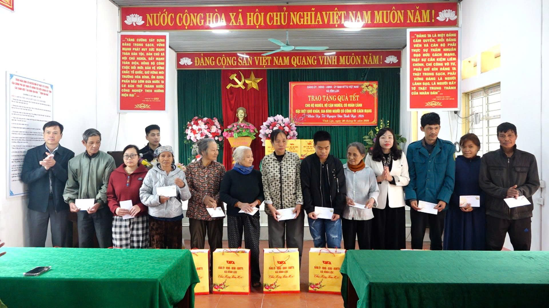 Đồng chí Trịnh Ngọc Tuân – Chủ tịch UBND xã, đồng chí Lưu Thị Thương – Ủy viên Ban Thường vụ Đảng ủy, Trưởng ban Xây dựng Đảng trao quà Tết cho hộ nghèo, hộ cận nghèo