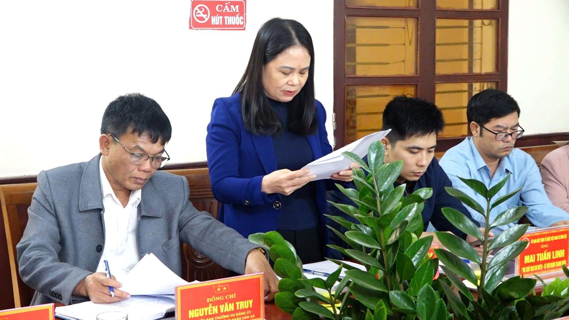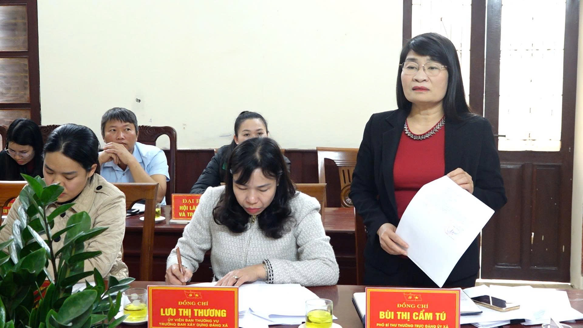Đồng chí Bùi Thị Cẩm Tú – Phó Bí thư Thường trực Đảng ủy xã, Phó Trưởng Ban Chỉ đạo bầu cử xã phát biểu tại hội nghị